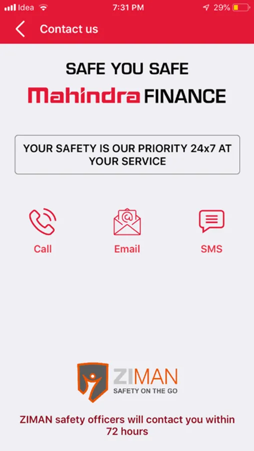 ZIMAN Mahindra Finance a smart AI (Artificial Intelligence) based solution, transforming safety through technology to support company compliances, policies and safety parameters for Corporate Safety), “ZIMAN” becomes your virtual protector that converts your mobile phone to a SAFETY HOMING - DEVICE providing 24×7 SOS Emergency Response Services with a backend customized operational software to help companies analyze and create efficient RCA- Root cause analyses report supporting a safety work environment for their employees.