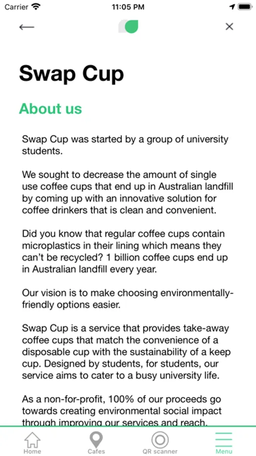 Swap Cup is an innovative sustainability program that allows users to borrow reusable coffee cups from participating cafes and return them when they are finished. Based in Melbourne and Queensland, Swap Cup aims to tackle the problem of disposable plastic coffee cups. Download the Swap Cup app today and subscribe to our program for a one month free trial.