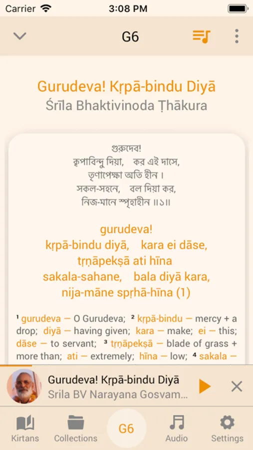 You will find all the invaluable kirtans of our ācāryas like Śrīla Bhaktivinoda Ṭhākura, Śrīla Narottama dāsa Ṭhākura, and Śrīla Rūpa Gosvāmī. The number of bhajans on the app will continue to increase.