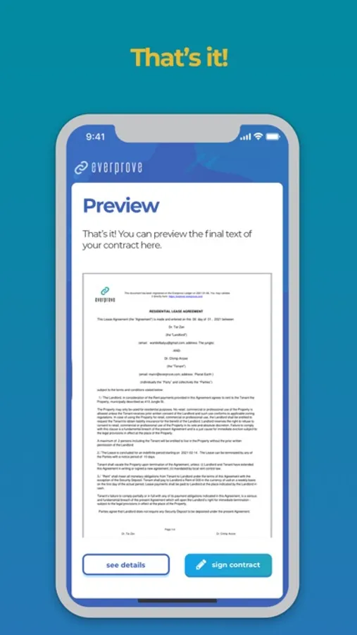 Everprove allows you to conclude and secure your deals easily from your smartphone. Using our contract templates, your deals will be properly documented and our application secures them with cutting-edge technology.