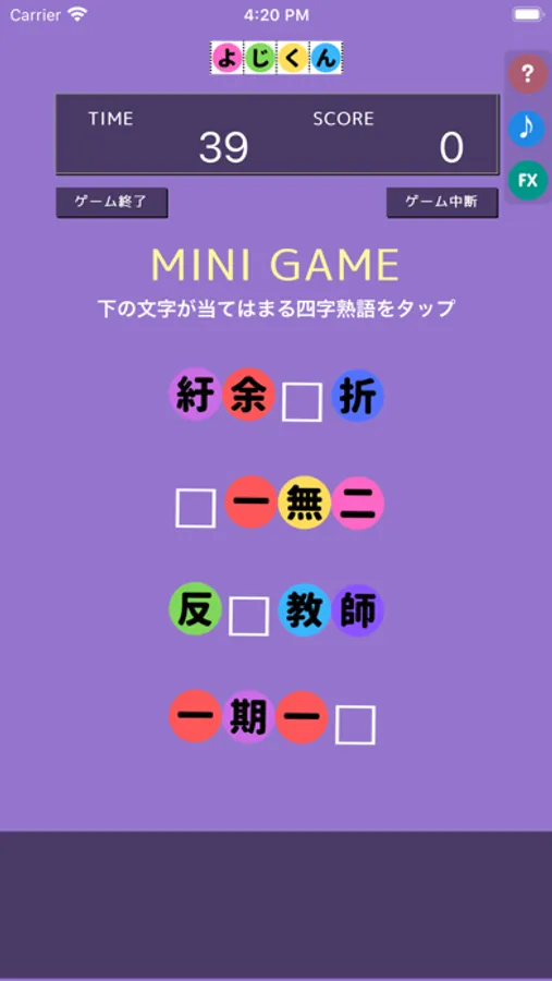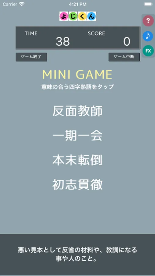 各レベルの合間にはミニゲームが用意されていて、メインゲームの復習をすることができます。繰り返し遊ぶことによってさらに四字熟語の知識は深いものになるでしょう。