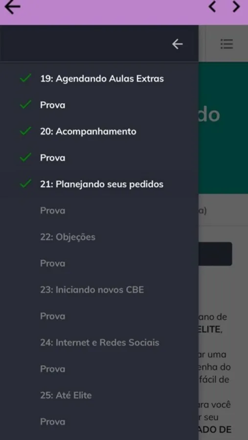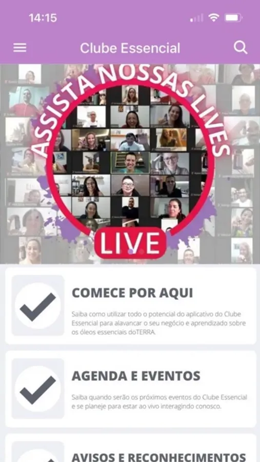 *O aplicativo tem funcionalidades abertas a todos e funcionalidades restrita aos membros da equipe Clube Essencial, geralmente na cor lilás e com um cadeado.