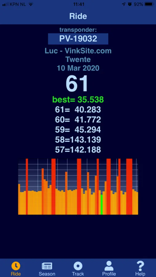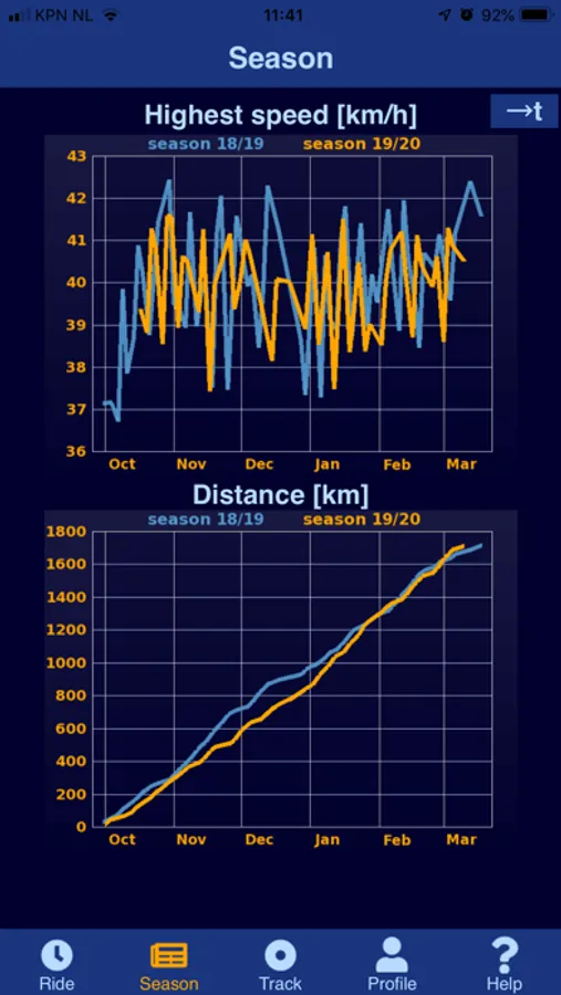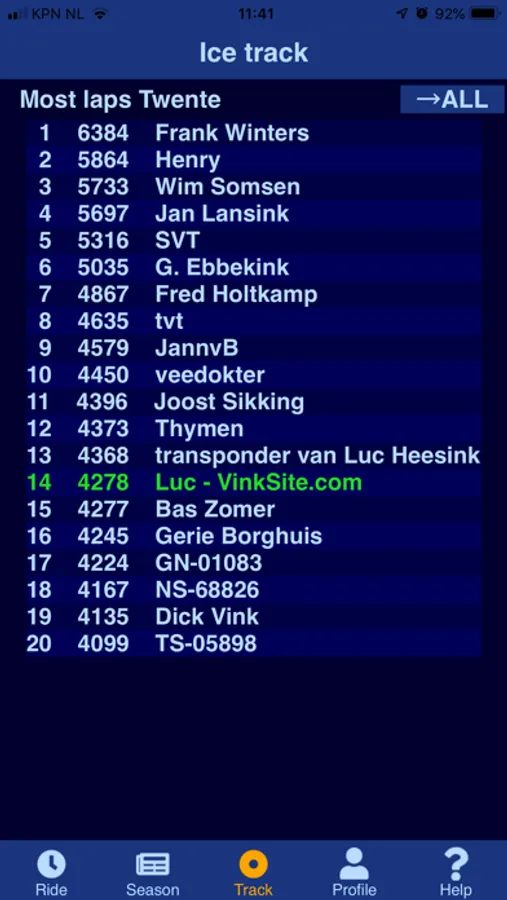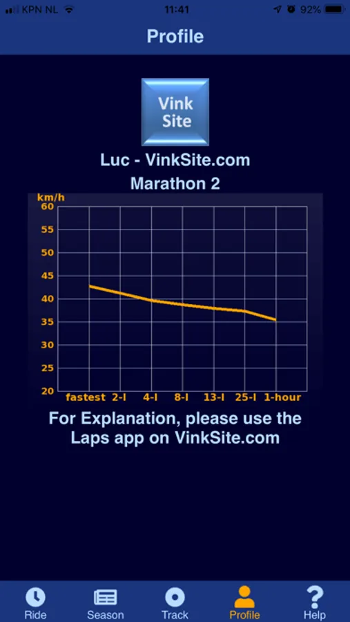 The Lap Counter app shows the information of your last ride, number of laps, lap times of your last 5 laps, start time and end time, and a graph of your last ride. The second tab shows your progress of fastest lap times and distance in the season compared to last season. Tab three shows a ranking of most laps of your ice track, and the fourth tab shows your profile with skater type characterisation. For more detailed analysis, use the Laps app from vinksite.com.
