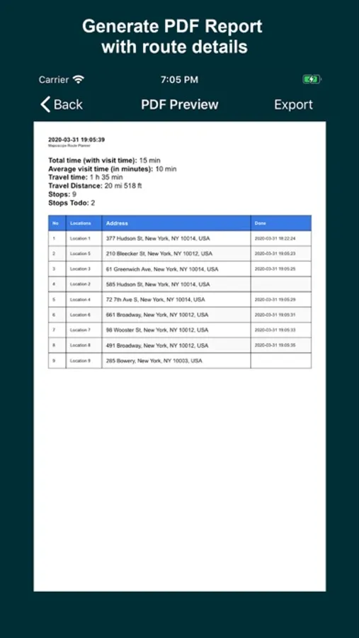 The route along with the time spent at the locations can be saved in a PDF report, saved to your disk or sent to your boss or client. Calculated Estimated Time of Arrival (ETA) will inform you (and your customers) of the time it takes for the products to arrive at the destination.