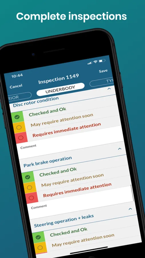 Your technicians can quickly and easily carry out an inspection from within the app. Inspections can handle template formats including green/yellow/red, comments, inputs, tyres and more.