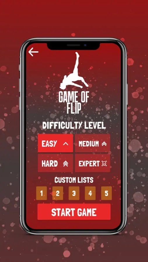 Game of FLIP is designed to give flippers from all skill levels a chance to have fun in a game of FLIP. In Game of FLIP you will find a Practice Mode and a Multiplayer Mode. Both modes are equipped with 4 different levels: Easy, Medium, Hard and Expert. In Game of FLIP, the game chooses a randomized trick for you, which makes sure all playershave an equal chance to win!