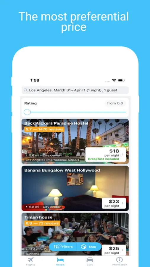 In addition to helping you find airline tickets, we also help you find accommodation. Compare prices of thousands of hotels, resorts, apartments and motels worldwide. Or find a room near your current location and hunt for last minute deals.