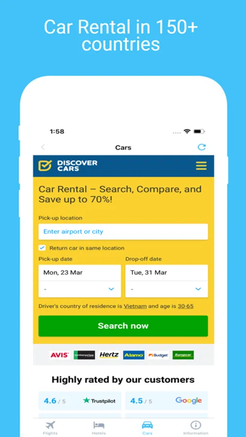 Choose the time and location you need to rent a car, and we'll help you find deals. You can search by vehicle type, fuel type and features. You can rent a car in more than 150 countries.
