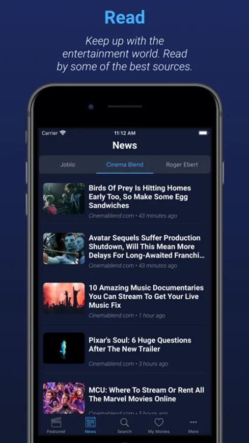 • Read the latest movie/entertainment related news by some of the best news sources such as Joblo, CinemaBlend, Roger Ebert.