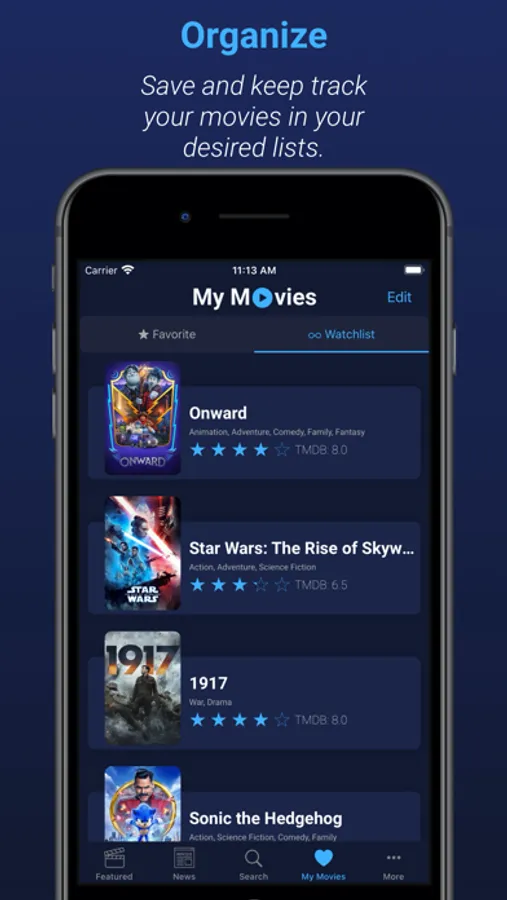 • Favorite and WatchList. Keep track of movies by adding them to your lists and share them with friends.