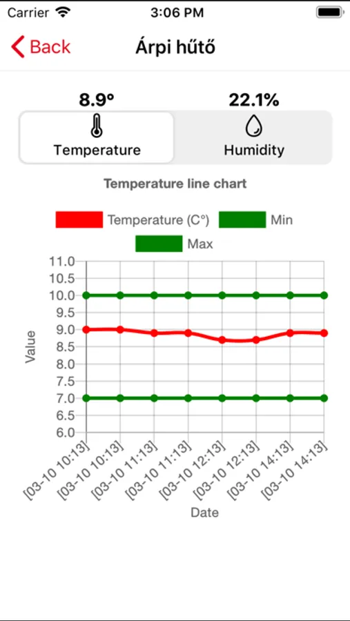 Szenzorok által mért hőmérséklet és páratartalom kijelzésére, határértéken túli mérések jelzésére szolgálló alkalmazás.