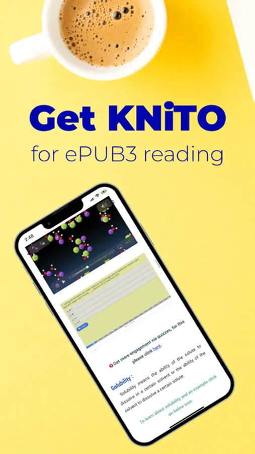 KNiTO is a modern ePUB3 book reader. ePUB3 is optimal for an immersive reading experience on mobile devices. It gives plenty of possibilities, including Audio, Video, Interactivity, Global Language Support, Reflowable and Fixed Layouts, Accessibility and much more. This has made it ideal for modern educational books, including K12 and university textbooks, monographs, training manuals, procedures books, and any content that can be conveyed better via ePUB3 elements.