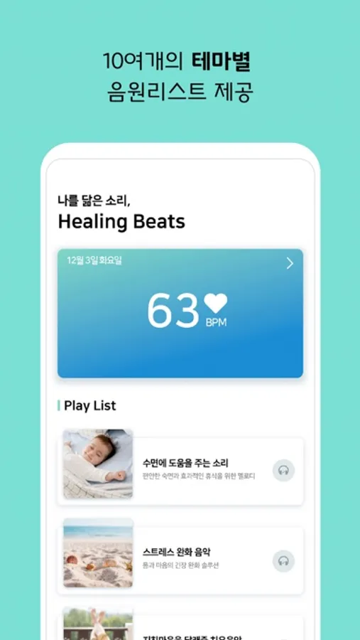 ‘나를 닮은 소리, 힐링비트’는 사용자의 심박동수에 맞춰진 BPM의 힐링음악을 통해 스트레스를 완화시켜주는데 효과적인 심신힐링 앱입니다.