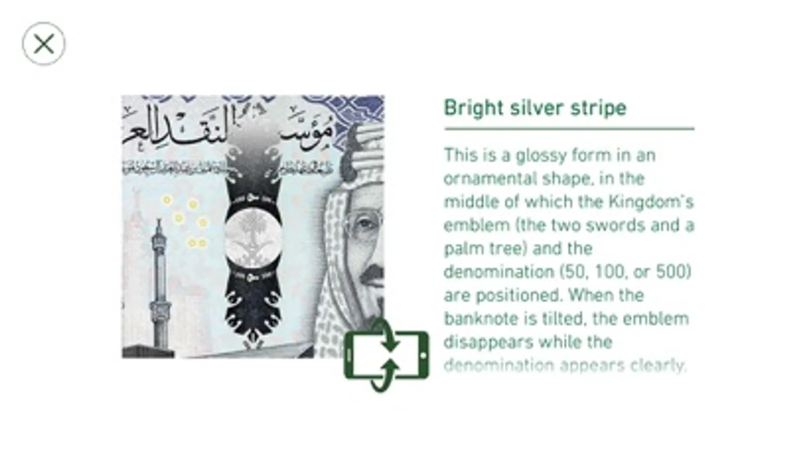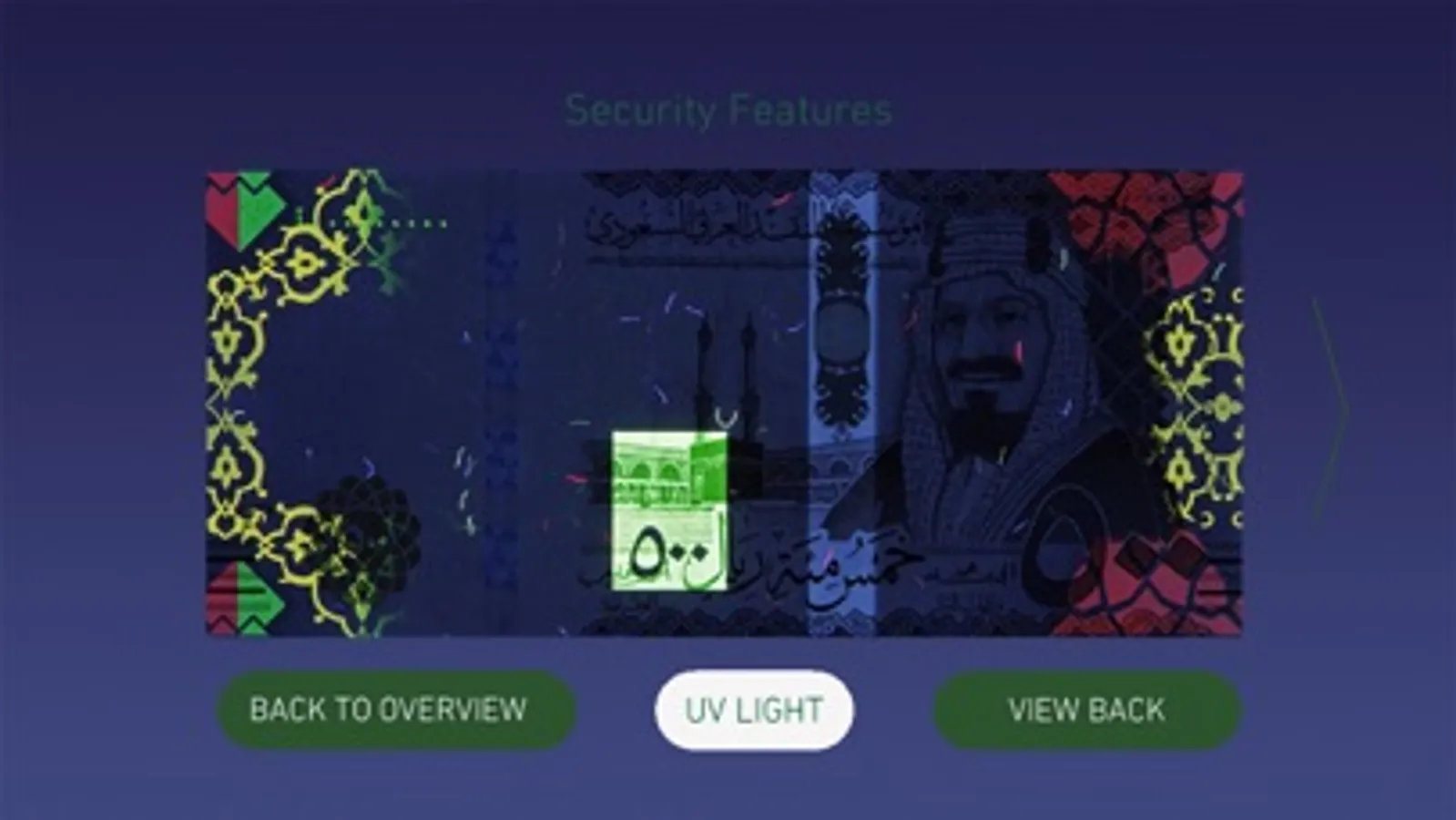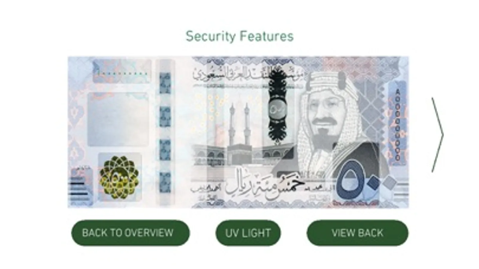 The ‘Saudi Currency’ application is an interactive tool for exploring the sixth issue of Saudi banknotes. This application allows users to discover the security features of the new banknote issue brought in circulation in 2017. It also shows in an interactive way how the security features react when a banknote is tilted, held against the light or examined by a magnifier glass.