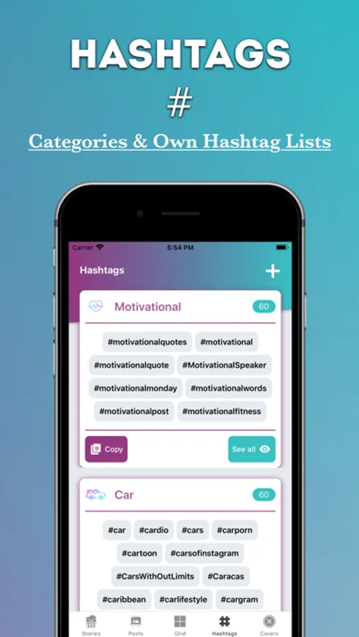 With this app you can browser thru 10 categories of hashtags as well as create your own hashtag lists.