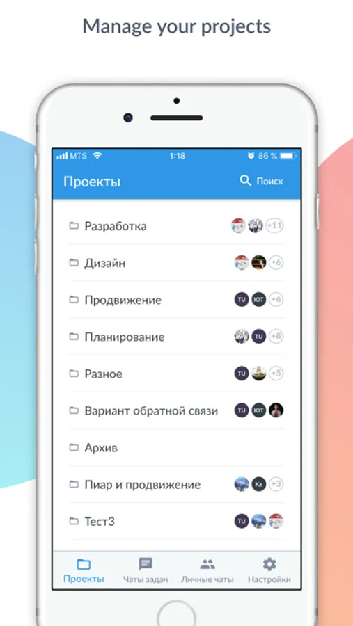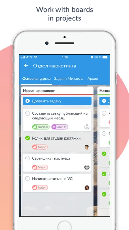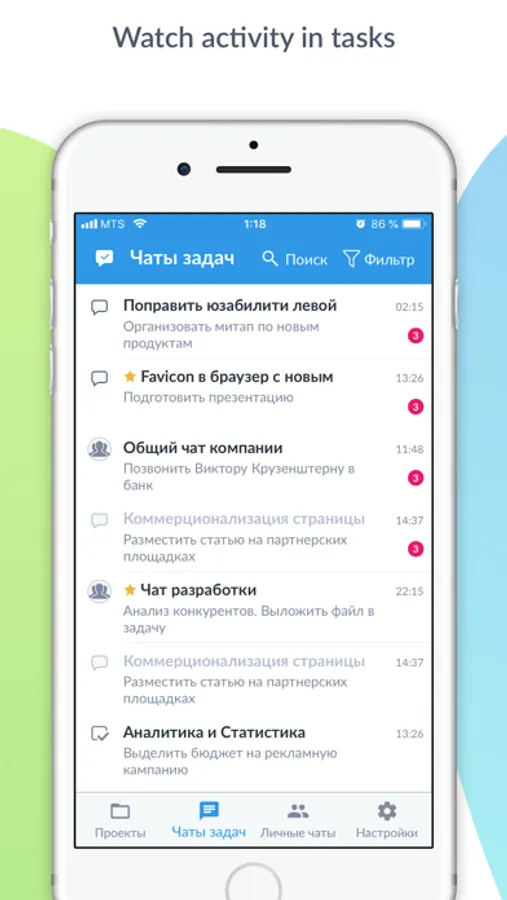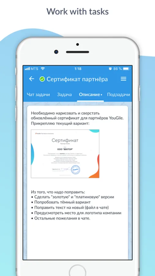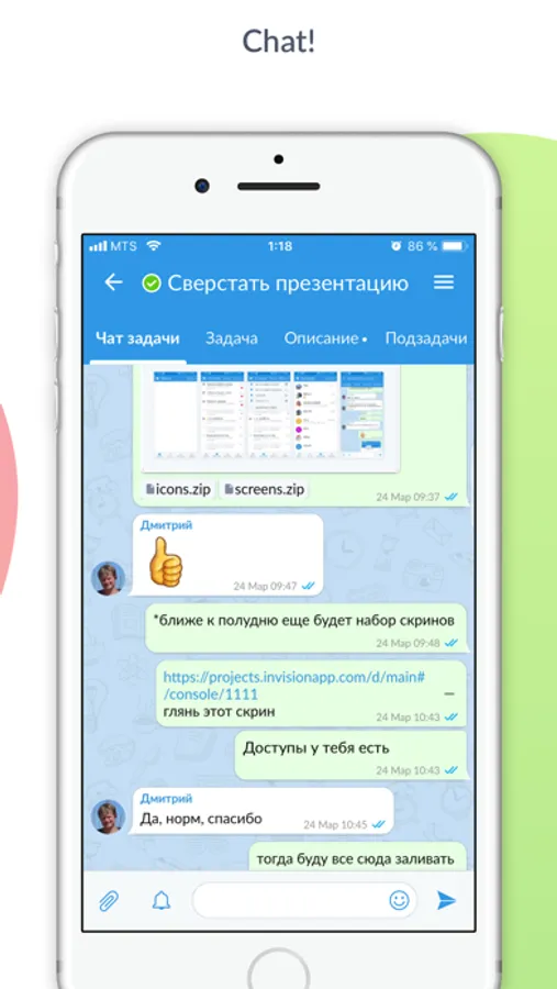Mobile app is a messenger combined with a task tracker. It brings together communcation and task tracking.