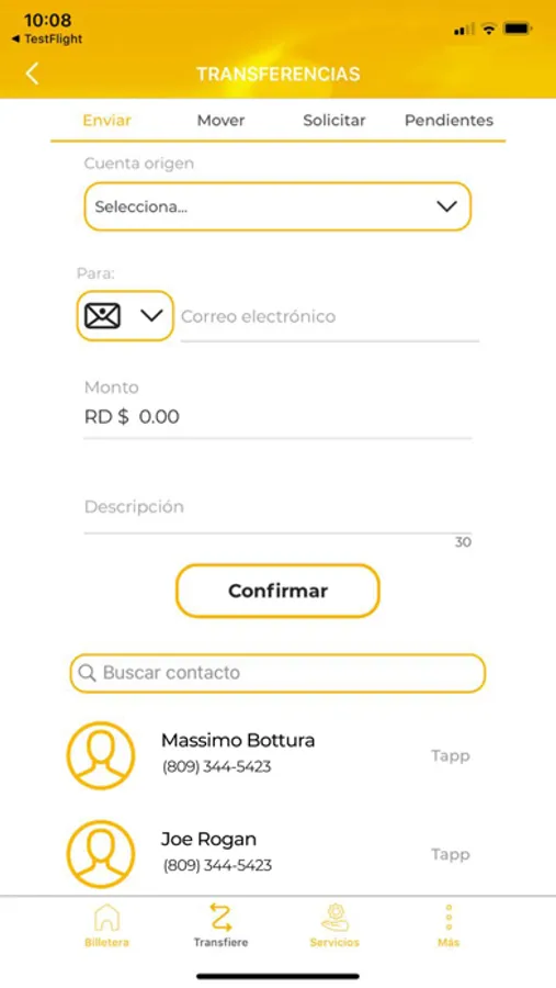 - Solicitar pagos. Envía dinero a tus contactos dentro del App.
