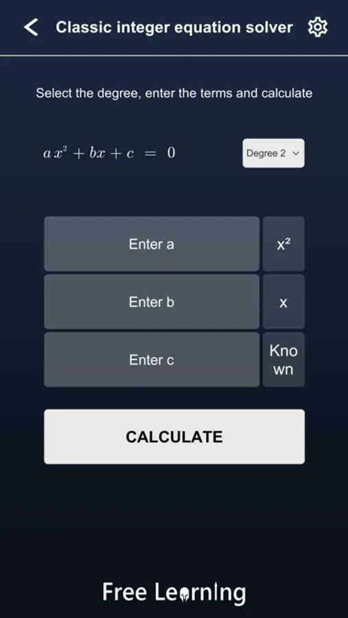 Practice solving integer equations of first or second degree of easy, intermediate, difficult difficulty.
