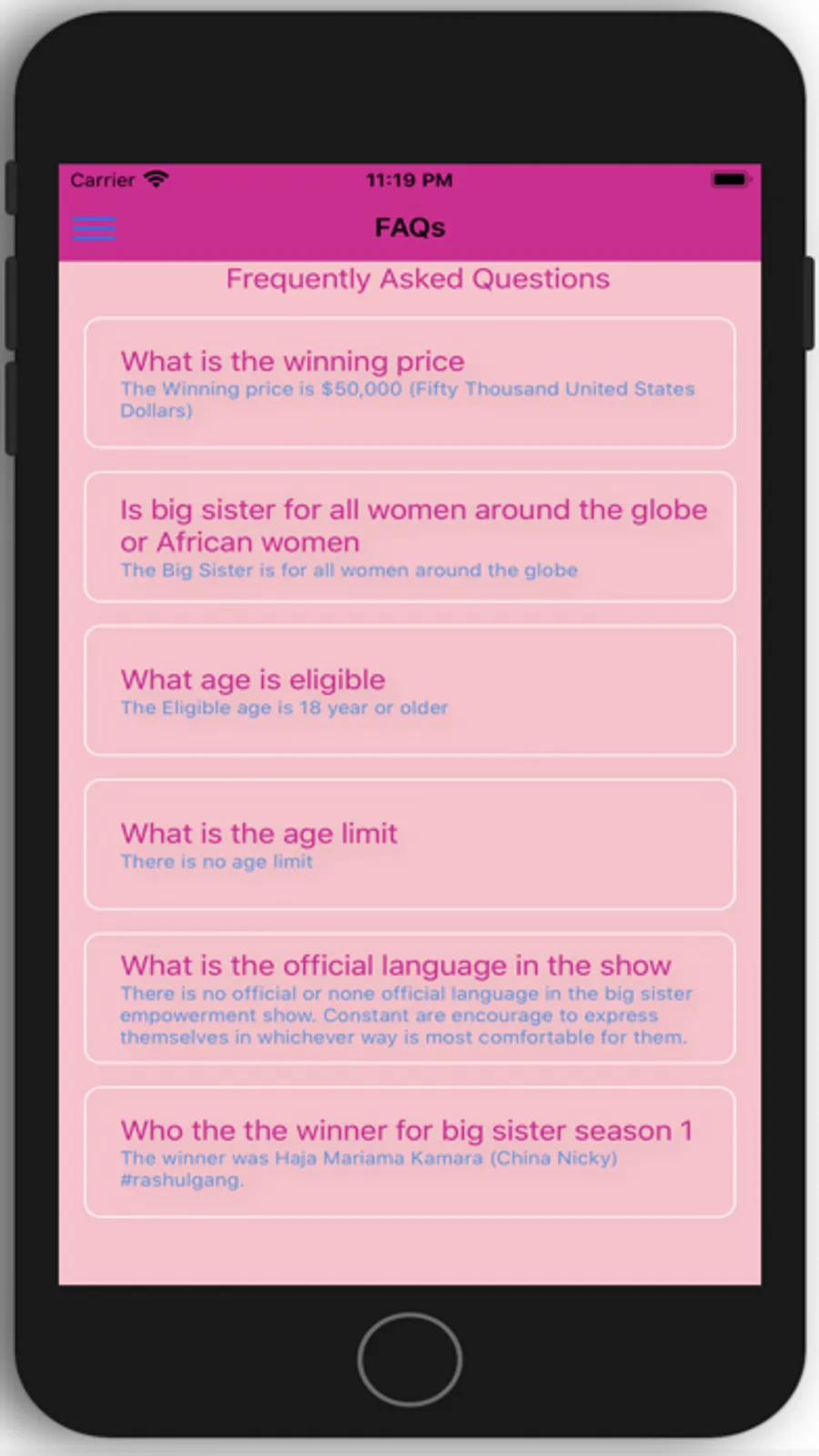 Big Sister Salone was the nation’s first live 24-hour reality TV show that brought together 12 Sierra Leonean women in a house for a period of one month, each vying for an opportunity to stay in the house at the end of every week after a public vote. This show was the brainchild of the ex-Big Brother Housemate and international model Zainab Sheriff.