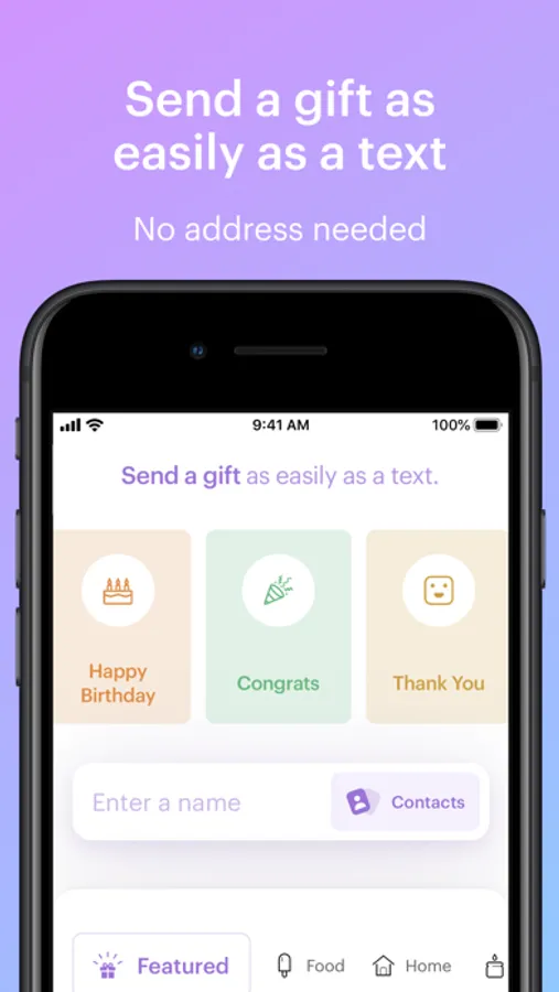 Give a gift with just a name and phone number, as easily as sending a text. No address needed and no payment up front.
