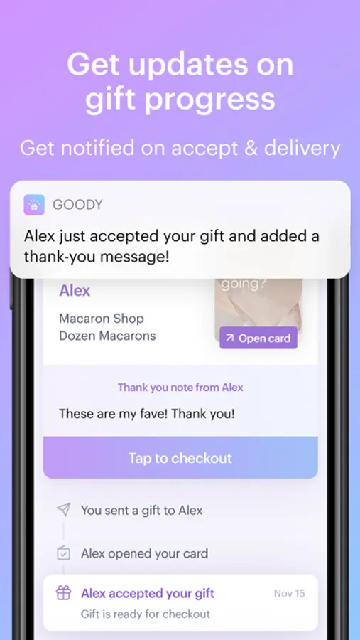 When you send a gift with Goody, your recipient gets a text with a beautiful unwrapping experience with your gift, a card, and message, and they can put in their address to accept the gift and have it shipped to them.