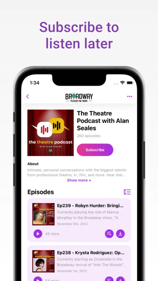 Broadway Podcast Network is all about creating an engaging, immersive, user-friendly experience where theatre stories of all kinds can be easily found, shared, and enjoyed. Part original programming, part hub for the podcasts you know and love, Broadway Podcast Network is building the perfect hub that includes award-winning content creators, all-star hosts, producers, writers, industry leaders, and storytellers of all kinds. With a vast range of theatre and theatre-adjacent programming, Broadway Podcast Network podcasts offer something for everyone. From content that includes behind-the-curtain access to the creative process, advice on everything from how to break into the business to how to audition, theatre history, and candid interviews with your favorite stars, Broadway Podcast Network’s audience includes theatre professionals and industry leaders, theatre students, up-and-coming artists, and theatre fans from all over the world.