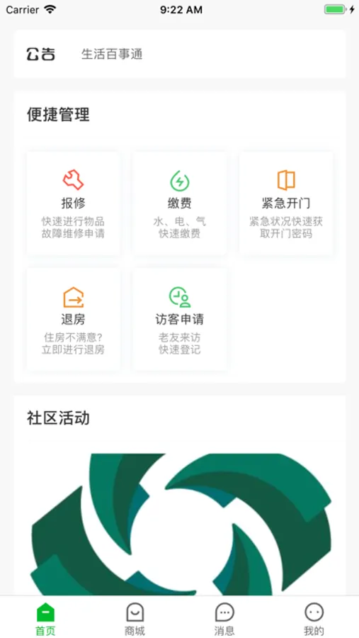 消息推送:智能门锁低电压报警推送;租赁业务相关信息推送(如合同、房租即将到期提醒,申请业务办结提醒推送);报修进度完结推送等。