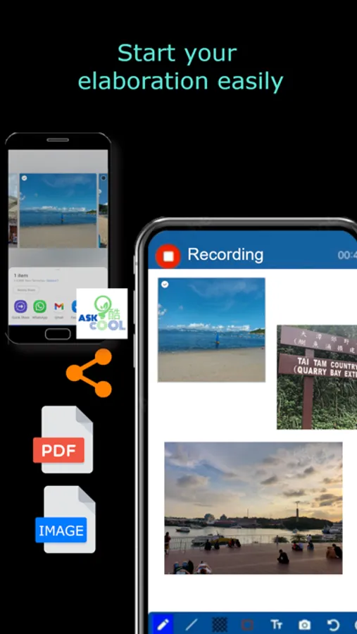 With AskCool, you can elaborate your ideas in synchronised video and audio for clear understanding. You can work beyond your time disregarding others’ schedules. You can start your elaboration as easily as sharing images and pdf files from other apps.