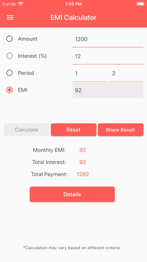 ● EMI Calculation result can be shared by WhatsApp or PDF to anyone