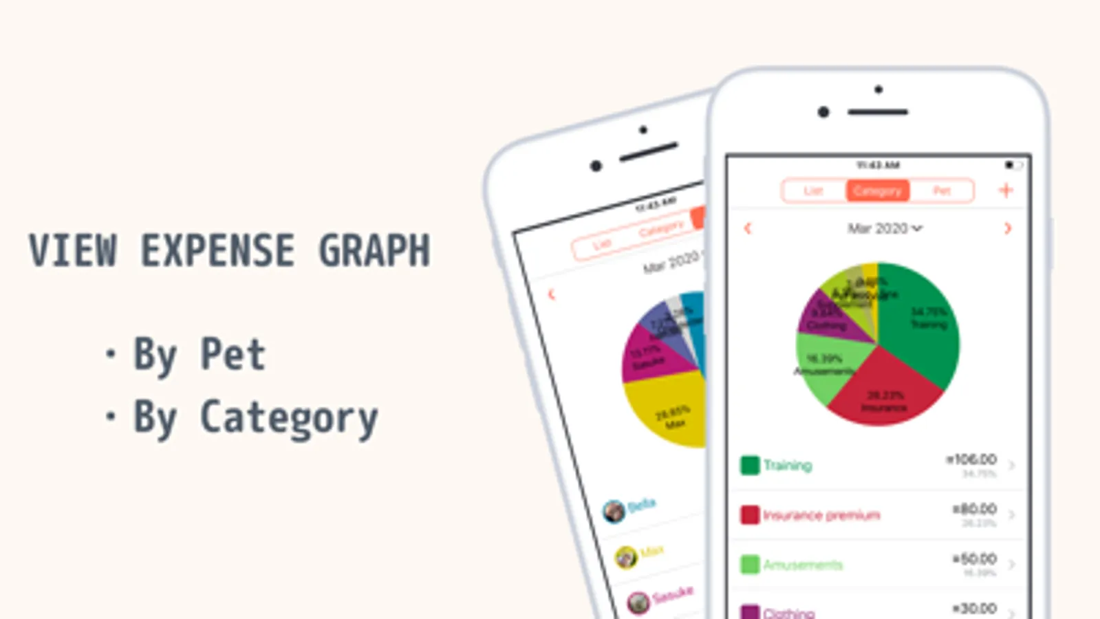 - It shows the ratio of the expenses by categories or pets on the pie graph.