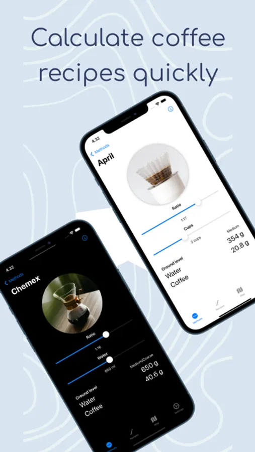 Bean Juice is a simple app for calculating your coffee recipes for you. Pick your preferred cup size in the settings and play with ratios and brew methods to find your perfect cup of coffee. Bean Juice currently supports Aeropress, Chemex, French Press and the V60, but we are working on adding more.