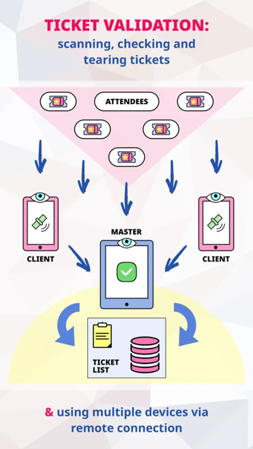 - connecting multiple devices using Bluetooth/Wi-Fi for ticket scanning & validation in remote master/client mode