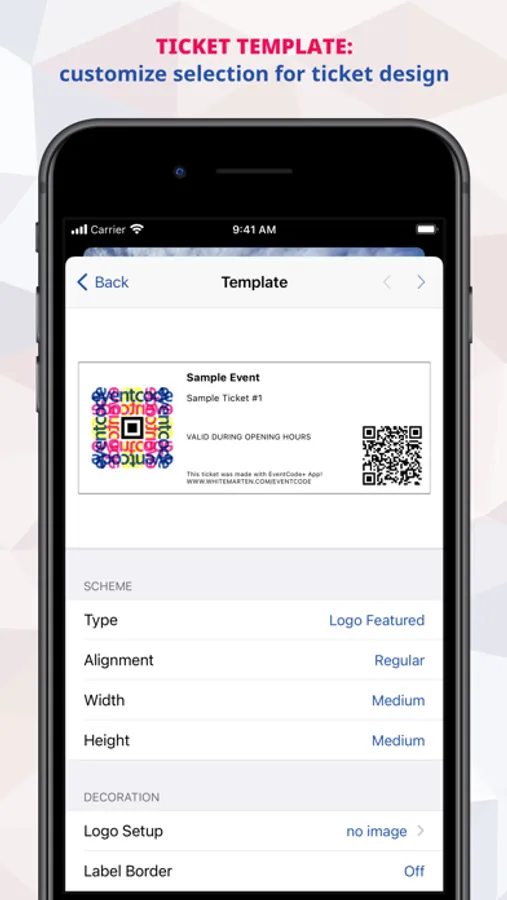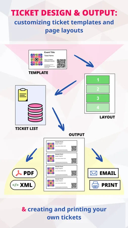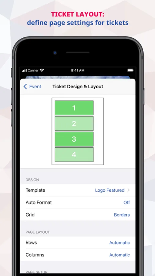 - customizing ticket layouts, choosing from multiple templates, page sizes and design options with custom logos and a variety of barcode types