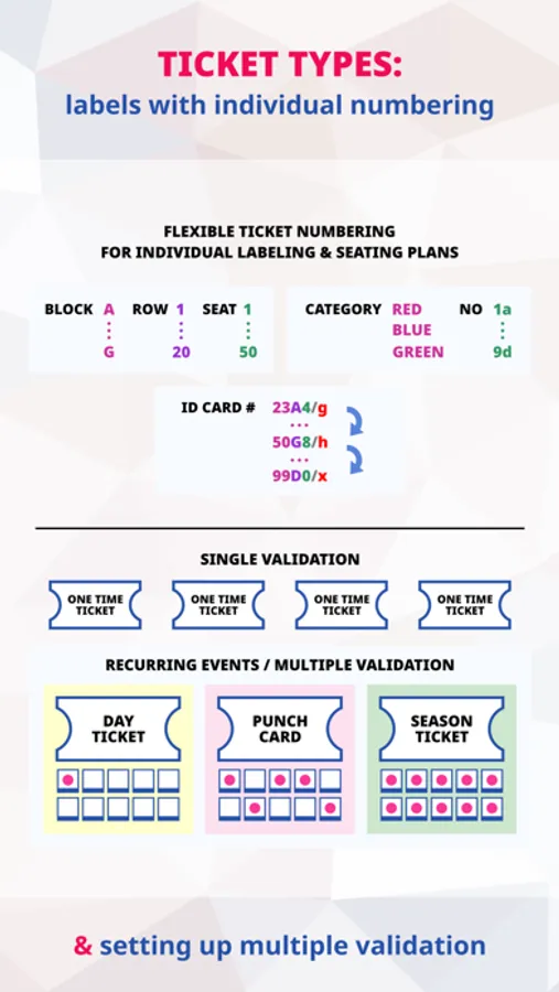 - individual labeling, dating and extended ticket numbering for implementing seating plans (e.g. blocks, rows, categories)