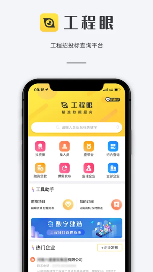 工程眼是一款专业的工程招投标信息查询工具,为用户提供建筑行业招投标信息搜索、资质查询、建造师查询、中标业绩查询、招标信息推送,机械租赁信息汇总等全方位服务。工程眼数据源于国家权威网站,信息真实可靠,通过大数据多维度对比分析,为建设主管单位、工程企业、金融机构、法院律所等单位提供专业的信用评估体系,助力建筑行业公平竞争和透明发展。