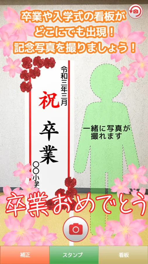 卒業式や入学式の立て看板と記念写真が撮れるARアプリです。
