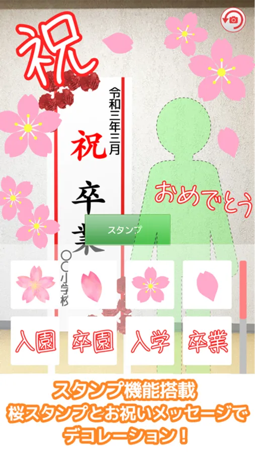 学校名や日付を入れたり、桜やメッセージ等のスタンプを押すといった機能があり、誰でも簡単に操作することが可能です。