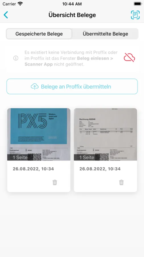Bei den bereits übermittelnden Belegen haben Sie die Möglichkeit, diese wieder in gespeicherte Belege zu verschieben, um dann erneut zu übermitteln. Die Konfiguration für die App wird einmalig durchgeführt, anschliessend bleibt die Proffix Scanner App bei bestehender Internetverbindung mit dem Proffix verbunden.