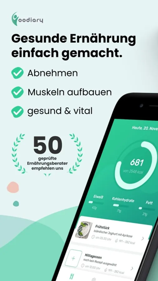 •Foodiary ermittelt für dich, welche Kalorien und Makronährstoffe du benötigst, um ein Ziel zu erreichen.