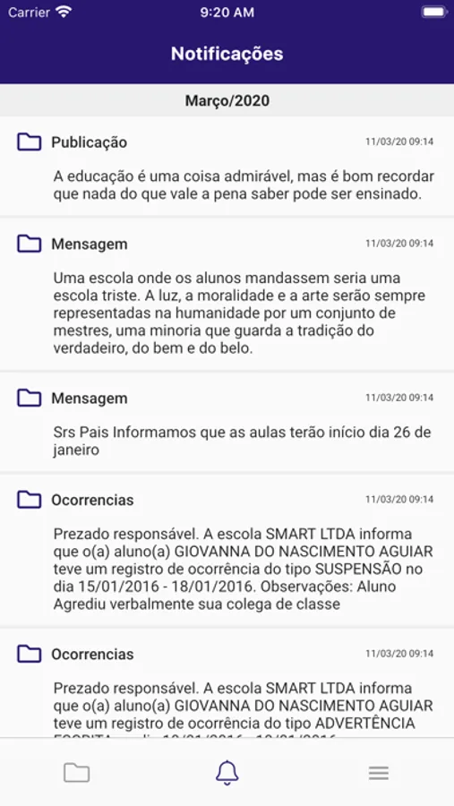Avisos, ocorrências escolares, declaração de pagamentos, enfim....