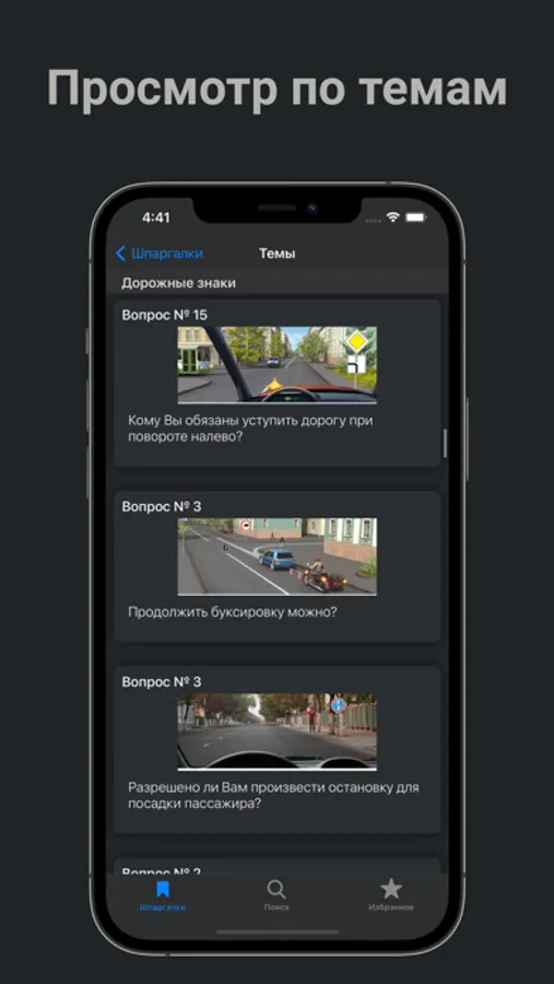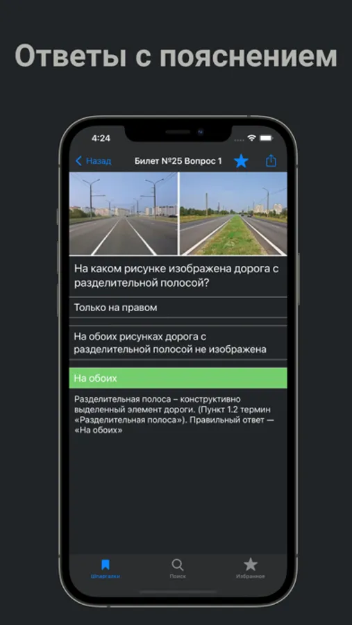 С каждым вопросом вам показываются всевозможные ответы и выделен правильный ответ, а также для каждого вопроса дается пояснение. Нажимайте на картинку и она покажется вам на весь экран, а еще можете делиться вопросами с друзьями!