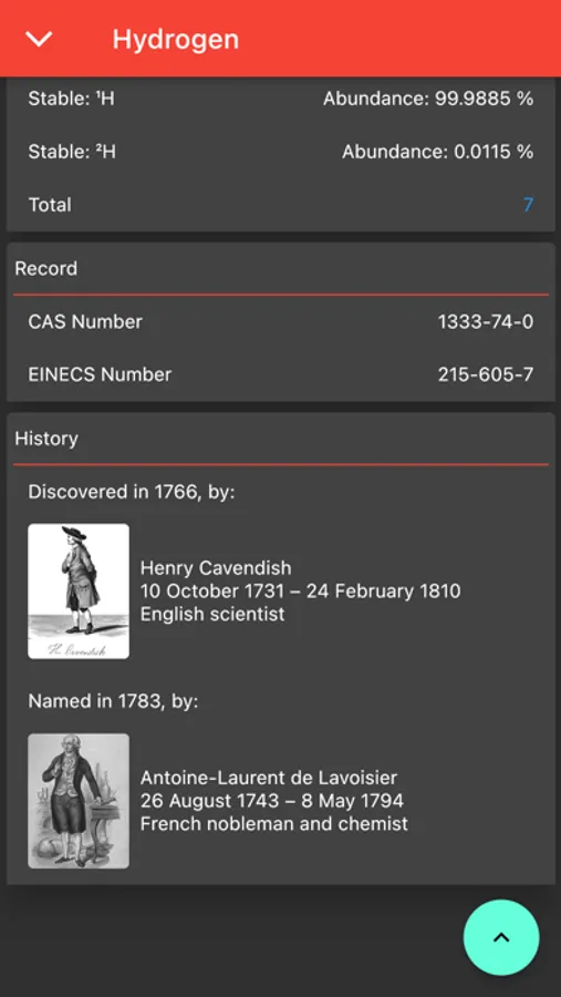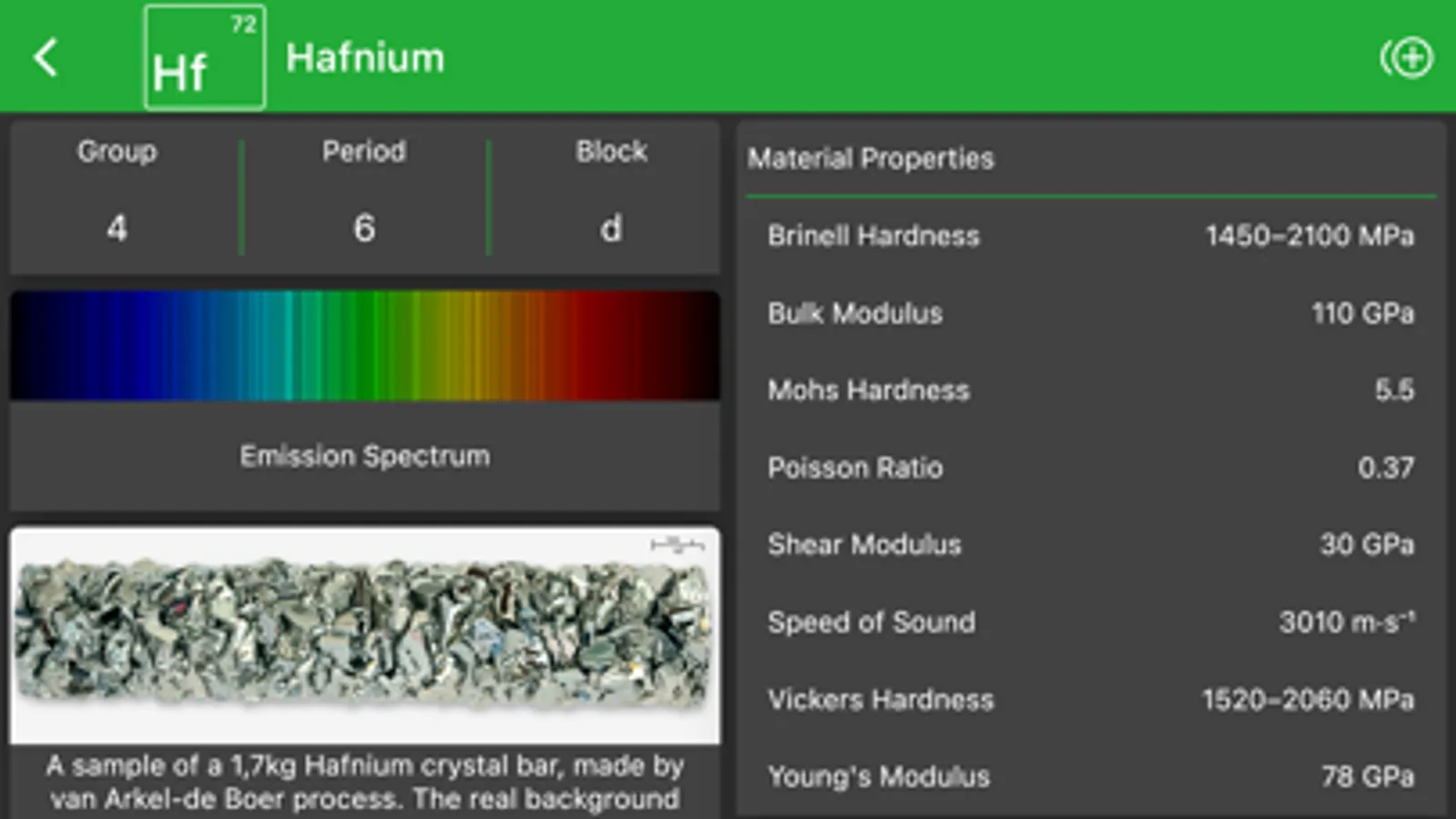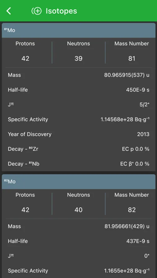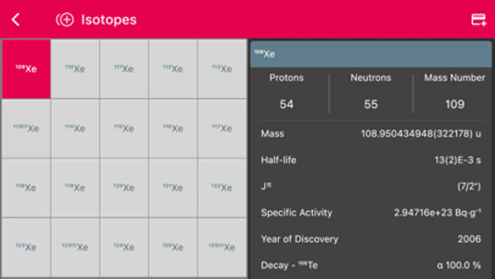 In the app You will find a huge amount of data about chemical elements. More than 5500 Isotopes of all the element are also in the app.