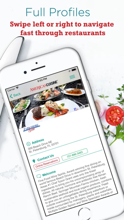 Every restaurant listing includes menus, photos, restaurant amenities, reservation capabilities and GPS directions to help mobile diners find the best meal in the city. Using advanced search options, pick your restaurant by name, location, cuisine type or meals served with the search option. The St. Pete Dining App is supported by AmericasCuisine.com, a Nationwide Dining Guide that diners and travelers have learned to trust over the past 20 years.