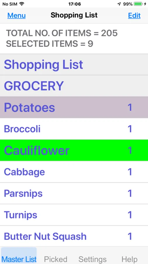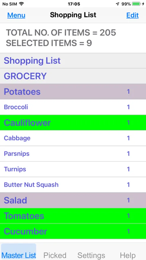 2/ By tapping an item in the ‘Master List’, its colour changes.