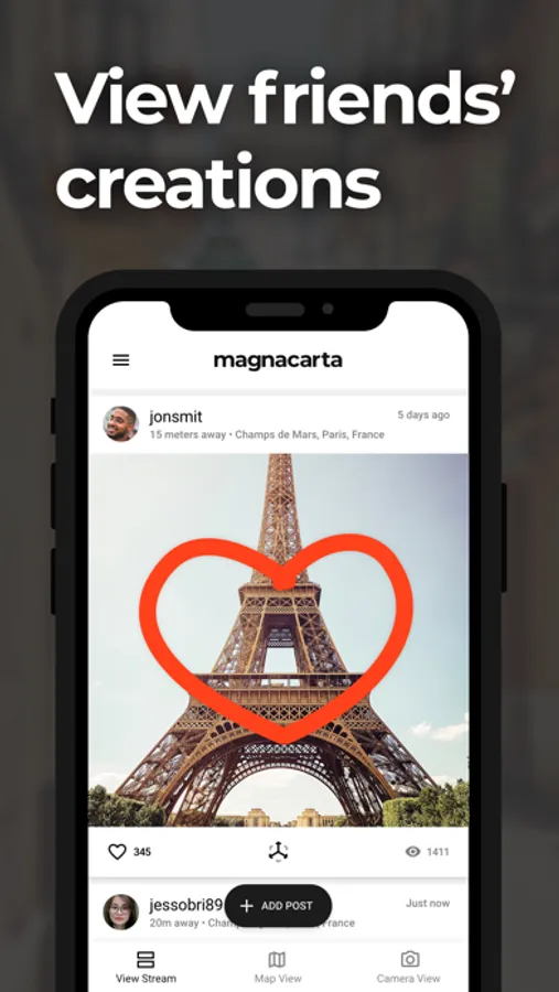 1. Observe people's posts in View Stream. Tap on it to see content in the AR world. Like it? Then like it!