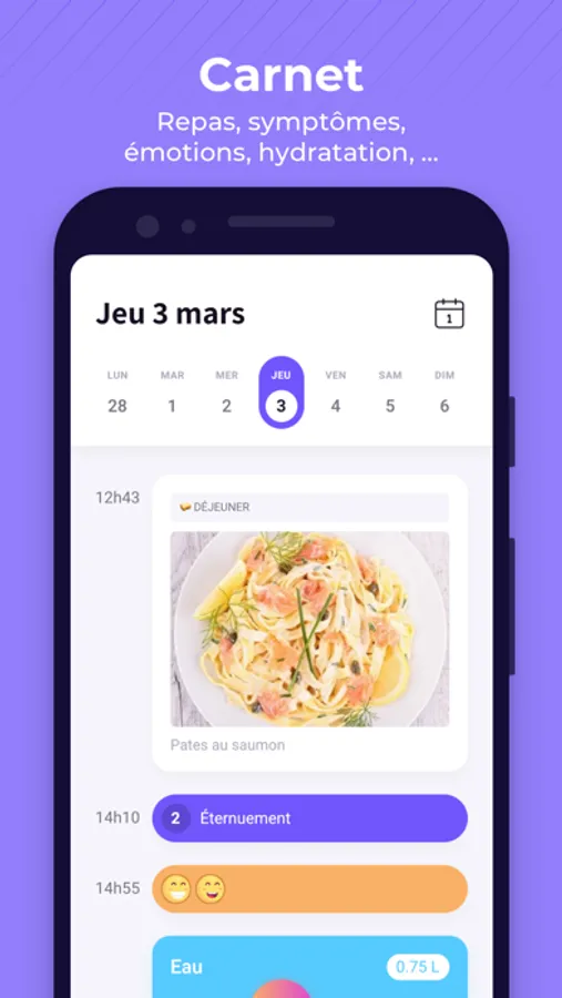 Le carnet vous permet d'enregistrer vos repas, maux, émotions, votre hydratation, etc ... de façon très intuitive ! Facile, simple et rapide !