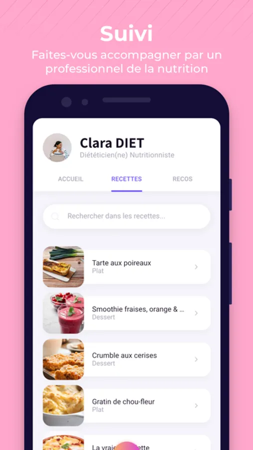 Trouvez dans l'application un professionnel de la nutrition pour vous accompagner au quotidien.