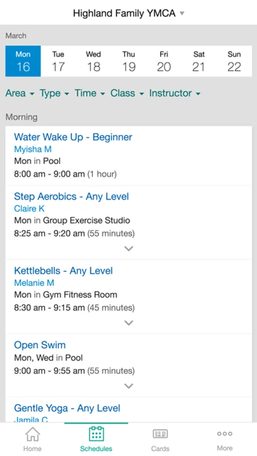 • Easily view schedules for each day and filter for the types of classes that you like.