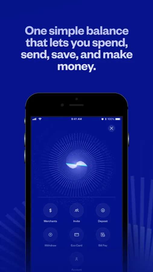 Eco is not a bank, checking account, or credit card. Instead, it’s one simple balance that lets you spend, send, save, and make money—all in one place.
