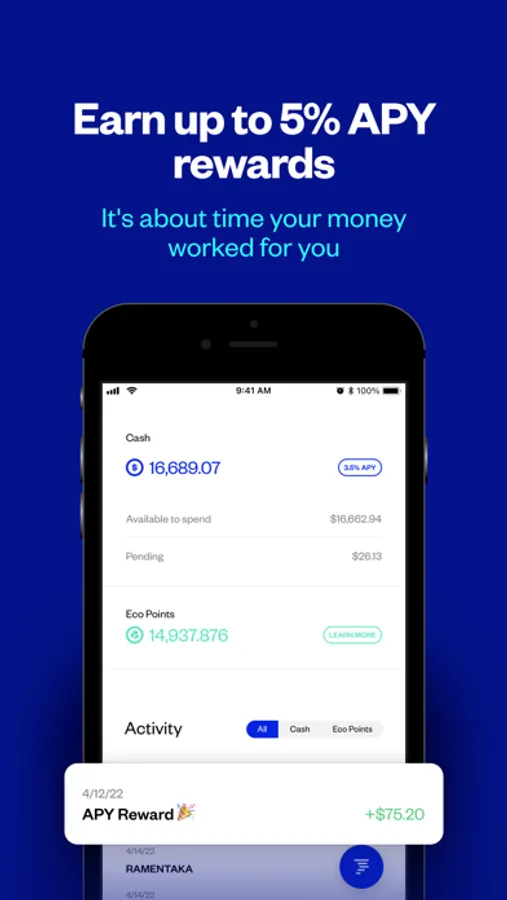 Earn up to 5.00% APY* rewards on your balance, plus Eco Points—the world’s first open rewards currency. And earn even more Points whenever and wherever you spend your money by using your Eco Card and Eco Bill Pay.